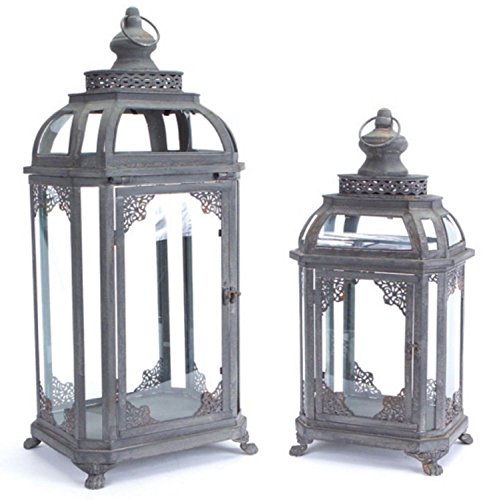 Elegant vintage style lanterns have an antique gray finish, glass inserts on all sides and arches and an ornate scroll work design Lanterns each hold (1) pillar candle (not included) Dimensions: 18.5-24.5"H Material(s): iron/glass
